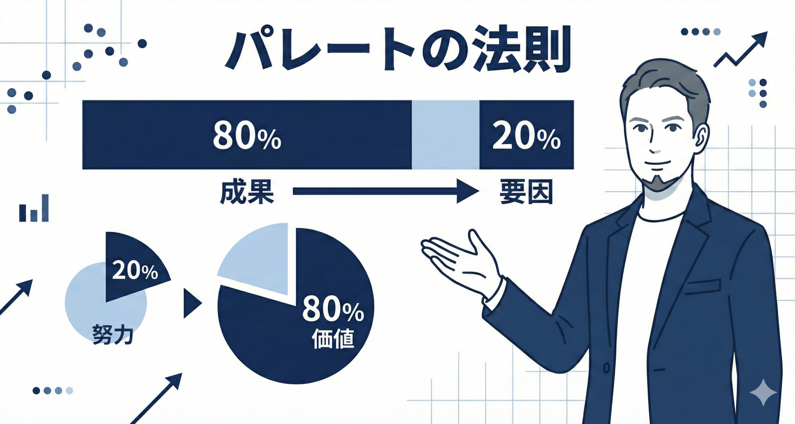 精神論ではなく、数字の話をしよう。パレートの法則とは、イタリアの経済学者ヴィルフレド・パレートが提唱した経験則だ。『結果の大部分(80%)はごく一部の原因(20%)から生み出される』という現象を指す。